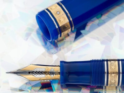 Commemorates the signing of the Maastricht Treaty. Embedded in the cap band is a small diamond stud. The pen shown below is number 2,454 of 3,500. Nib is firm, but not quite nail-like.